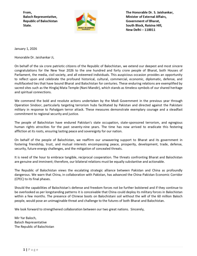 బలూచిస్థాన్ మానవ హక్కుల నేత‌, బలూచ్ రిపబ్లిక్ ప్రతినిధి మీర్ యార్ బలూచ్ (Mir Yar Baloch), భారత విదేశాంగ మంత్రి ఎస్. జైశంకర్‌కు జనవరి 1, 2026న బహిరంగ